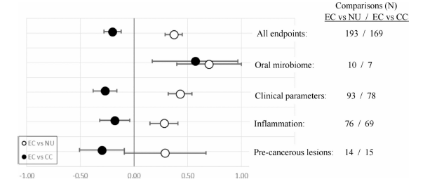 The review discusses the results from 52 studies suggesting a reduced risk for EC users as compared to smoking. Yet, oral health status remains poorer compared to not using any tobacco/nicotine products. This is indicated by the scores in the following figure vor EC usage. Negative score illustrates potentially reduced risk for people who vape compared to people who smoke, which is generally the case. However, there is still an elevated risk relative to no nicotine/tobacco use. Most studies lack comprehensive characterization of cohorts and compliance monitoring